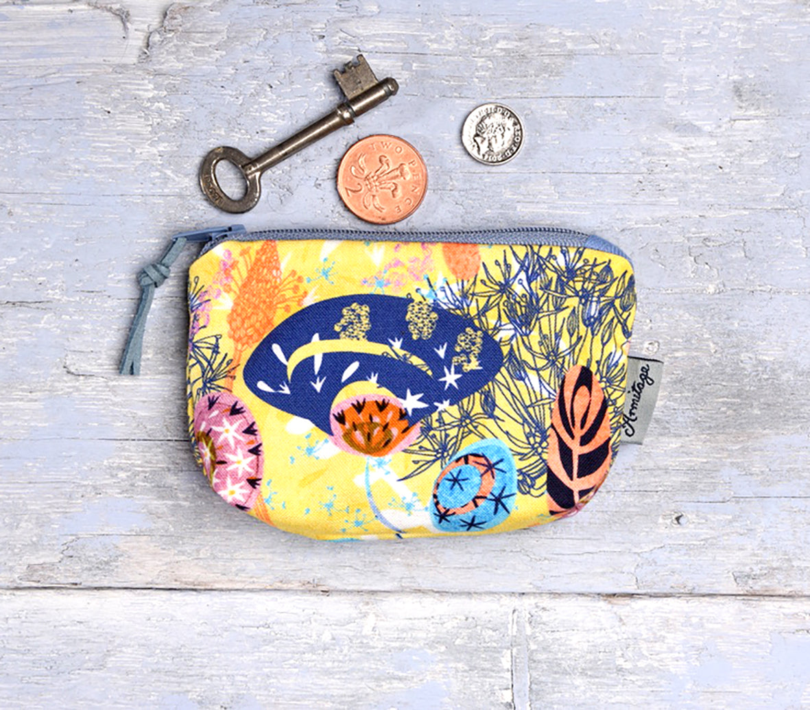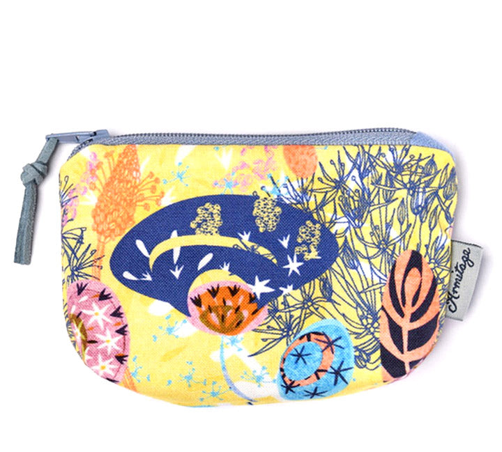 The beautiful Alium Sunbeam coin purse is part of the Alium collection, it features imagery of flora and fauna with fascinating hidden narratives. Studies of sculptural and architectural Alium flowers, which are part of the onion family; are layered with drawings of plantain, purported for its medicinal and culinary properties; and Equisetum or ‘horsetail’, which can be described as living fossil having existed for over 100 million years.