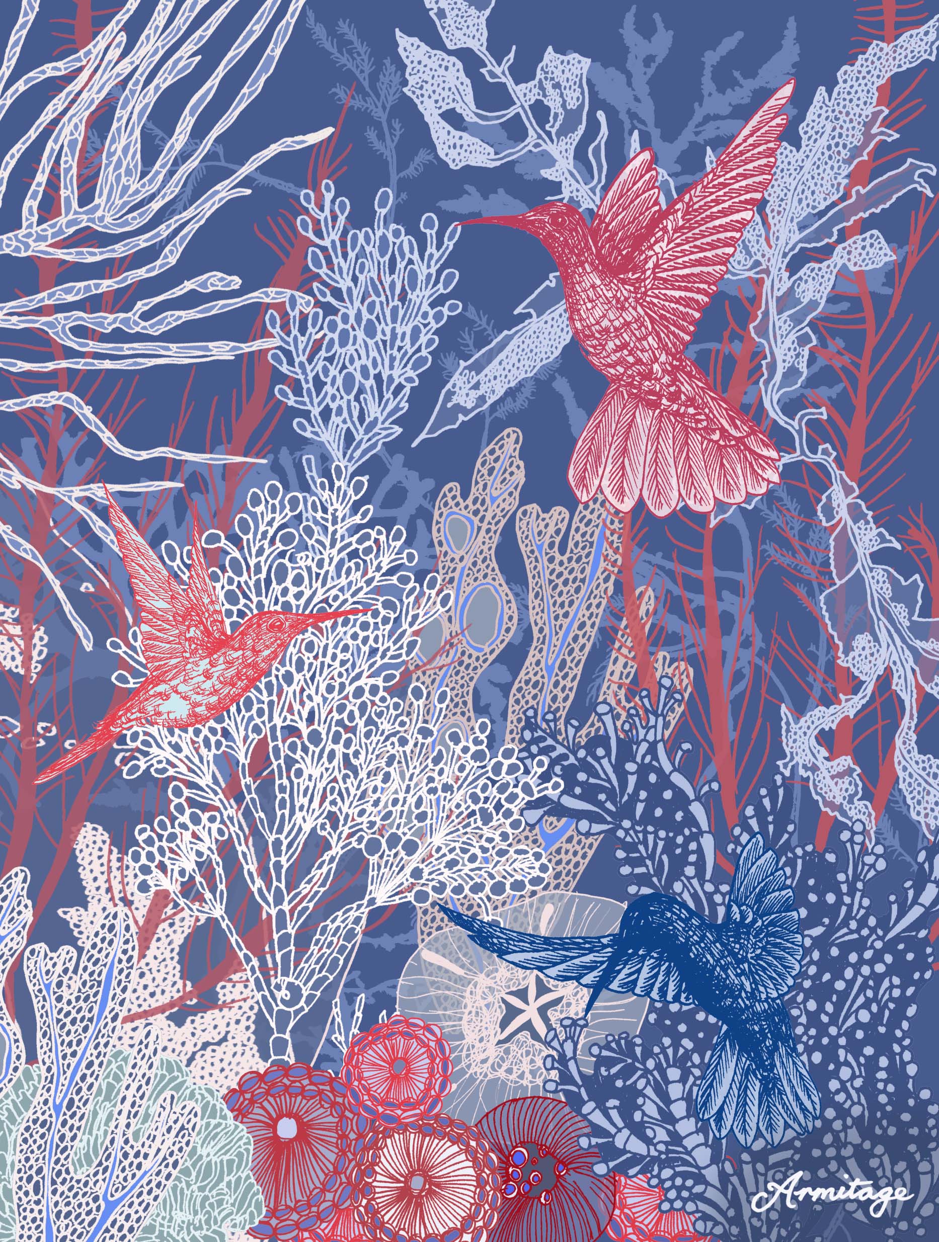 The exquisite Coral Deep print features my illustrations of Corals, butterflies, hummingbirds, seaweed and garden flowers.