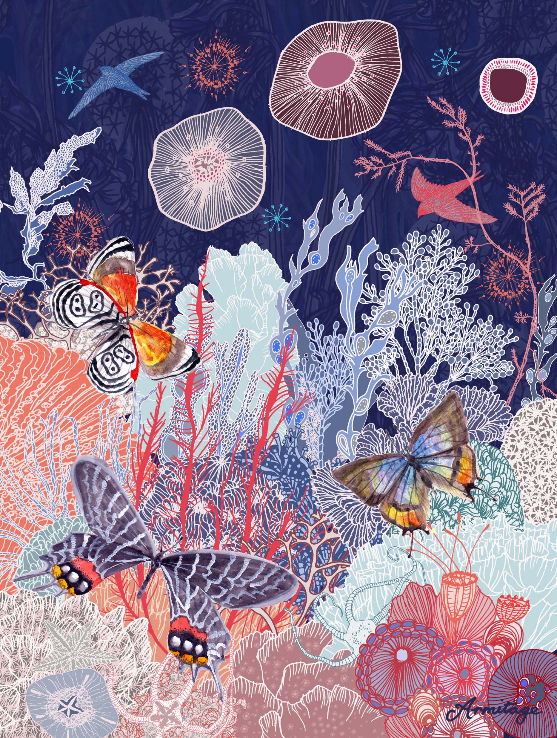 The exquisite Sea Garden print features my illustrations of Corals, butterflies, swallows, seaweed and garden flowers.