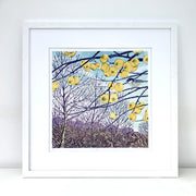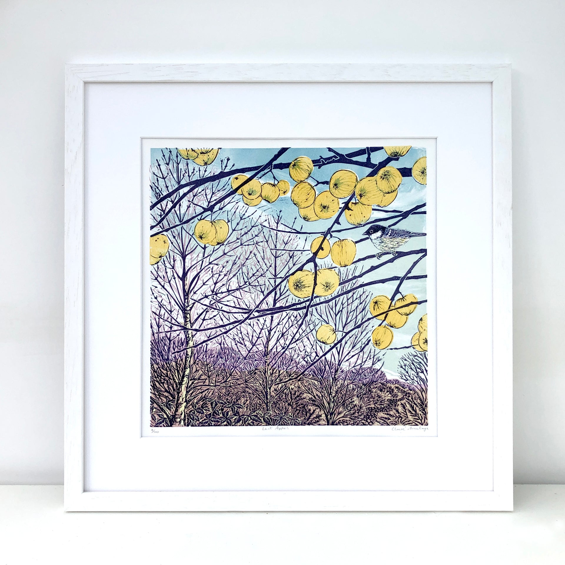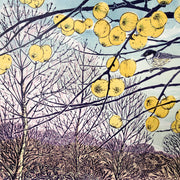 When creating the preliminary drawings for this limited edition lino print I found myself revisiting this crab apple tree in wind, rain, and sunshine, sketching amidst the tangle of branches bejewelled with golden apples to capture the perfect composition. During one of my sessions, a tiny bird I didn’t recognise paid a fleeting visit, inspiring me to consult my bird book for identification. I discovered it was a coal tit, and though its stay was brief, I did my best to capture its presence in the artwork. The crab apple tree also played host to blackbirds, a thrush, and a Fieldfare, all enjoying the last of the winter fruit.  I gain a deep sense of place by revisiting the same locations to draw and paint from direct observation, exploring the colours and fauna as they change with the seasons and time of day.  Back in my studio I create detailed botanical studies of the plants I’ve collected.  Gradually I develop the compositions and colours for my prints, often layering the minutia of nature within larger landscapes.  This print measures 31 by 31 cm.