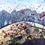 This print was inspired by the vibrancy of winter rosehips and the song thrush I watch each January feeding on ivy berries in the hedgerows beside my studio. I gain a deep sense of place by revisiting the same locations to draw and paint from direct observation, exploring the colours and fauna as they change with the seasons and time of day. Back in my studio I create detailed botanical studies of the plants I’ve collected. Gradually I develop the compositions and colours for my prints, often layering the minutia of nature within larger landscapes. This print measures 31 by 31 cm.