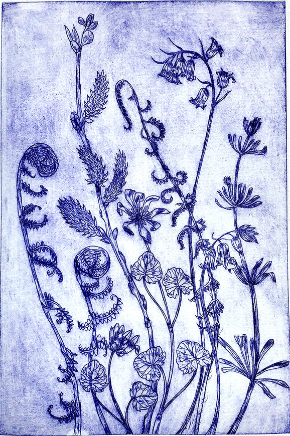 This print illustrates the fine details of bluebells, ferns, plantain, willow catkins, and celandines. All my prints are handprinted in small batches, this print is a limited edition of 20 etchings.