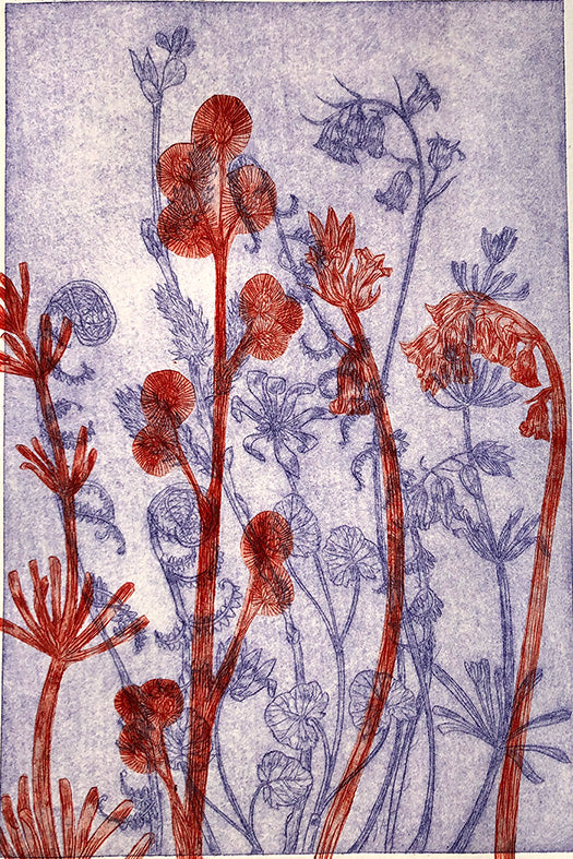 This print illustrates the fine details of bluebells, ferns, plantain, willow catkins, and celandines. All my prints are handprinted in small batches, this print is a limited edition of 20 etchings.