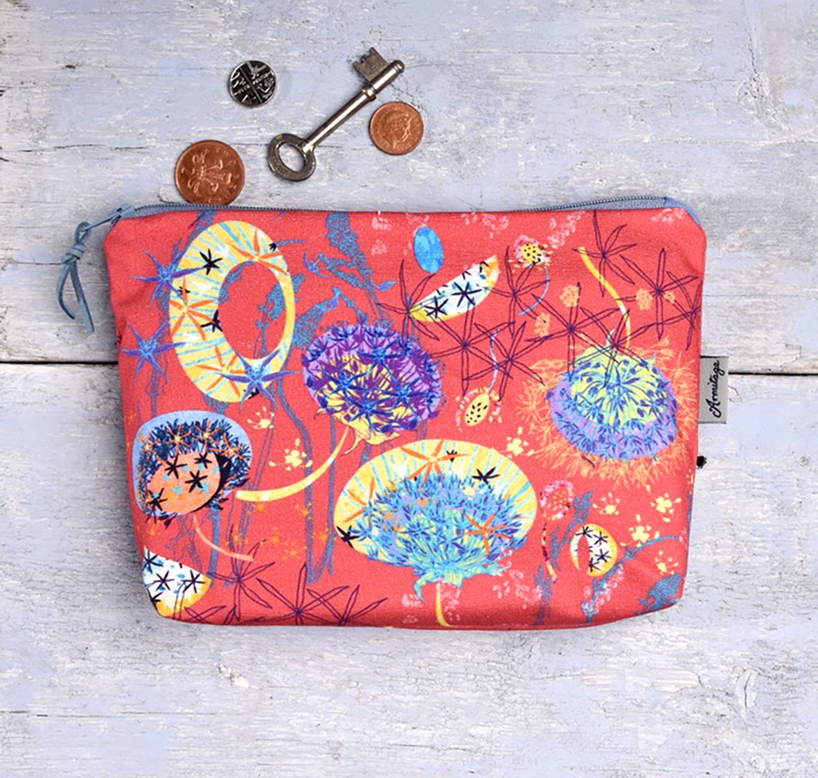 The intricate design features carefully layered imagery from my botanical drawings and monoprints of these natural elements. The rich crimson tones of the Alium Crimson make-up bag are elegantly complemented by deep indigo, warm yellow, and dusky pink hues, making it a striking and stylish accessory.