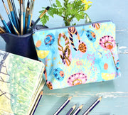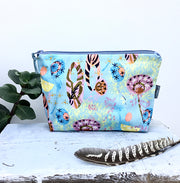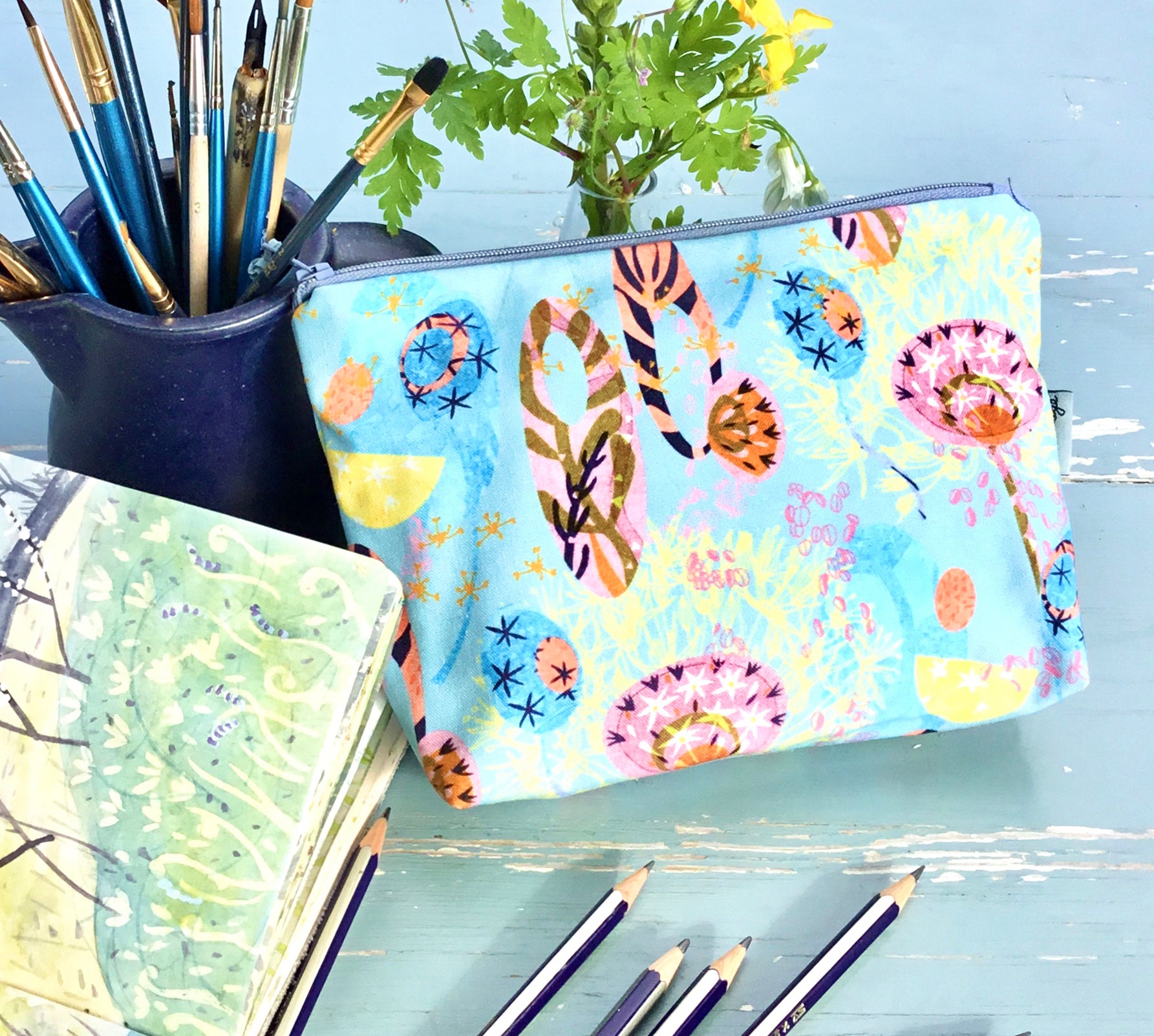 The intricate design features carefully layered imagery from my botanical drawings and monoprints of these natural elements. The subtle silvery blue tones of the Alium Dawn make up bag are elegantly complemented by deep indigo, vibrant azure blue, and dusky pink hues, resulting in a striking and stylish design that is both visually appealing and practical.