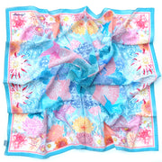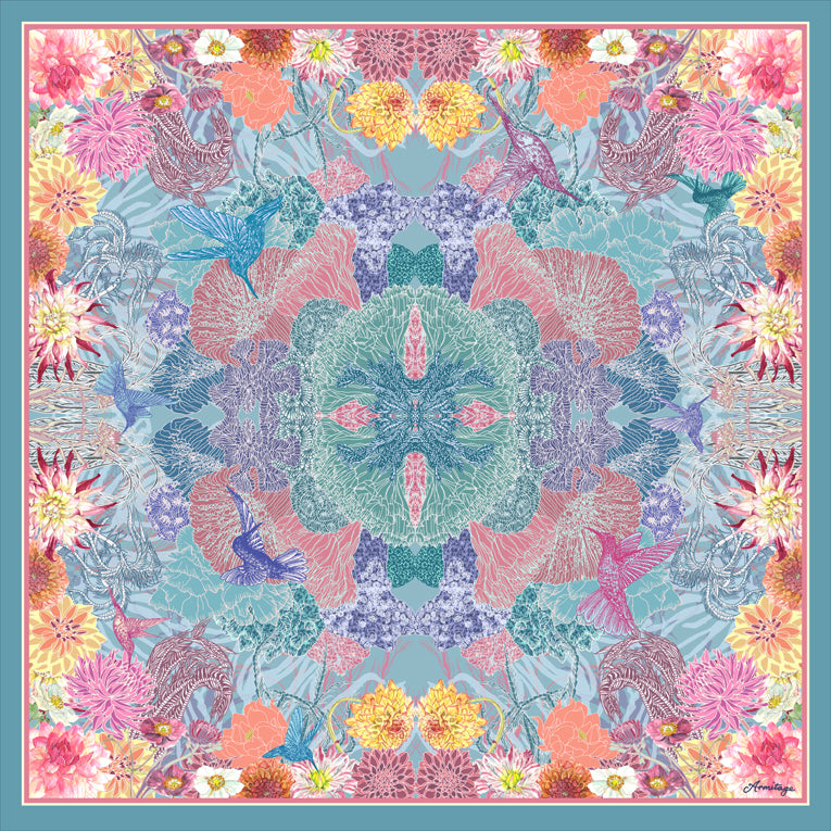 The exquisite Faye silk scarf print design features my illustrations of corals, hummingbirds, seaweed and garden flowers.