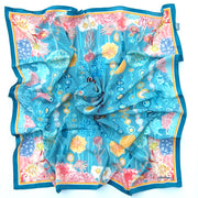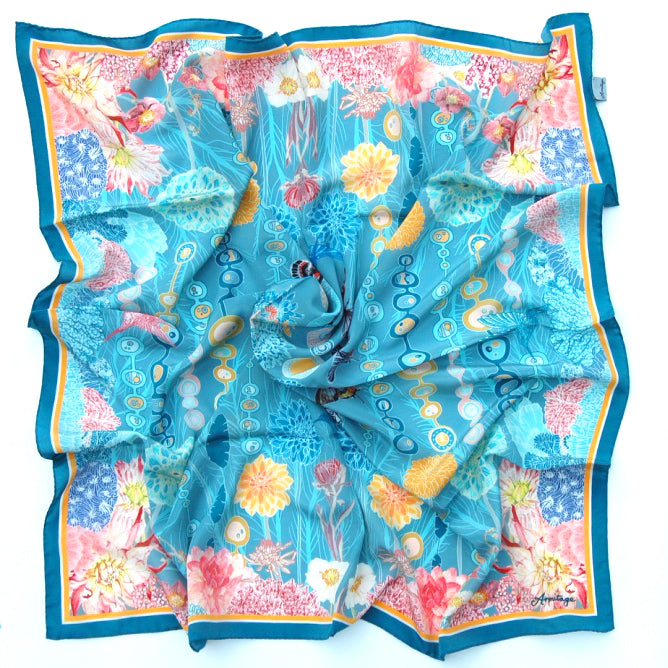 This silk scarf is part of the Museum Botanical collection. I was inspired by the natural history collections within Royal Albert Memorial Museum, particularly the 19th century collections of Echinoderms such as starfish and sea lilies, rare and tropical butterflies, and the adjacent treasure trove of bird specimens from across the world. I combined this research with collections from beyond the walls of the museum, including studies of pressed seaweed and coral collected in the early 20th century.