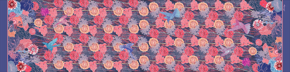 The exquisite Nancy print design features my illustrations of corals, hummingbirds, seaweed and garden flowers.