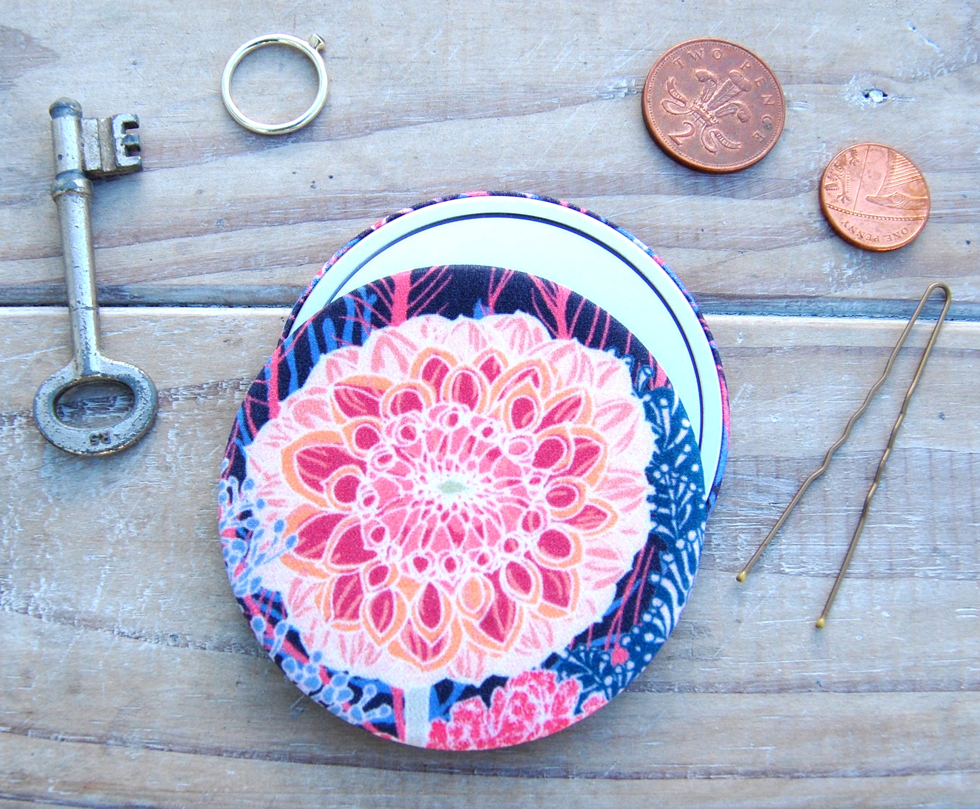 This luxurious handmade compact mirror would add a splash of colour and style to compliment your wardrobe and would make an ideal gift.