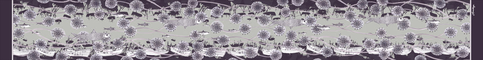 The exquisite Moonlit print design layers Claire's delicate illustrations of fishing boats, dandelions and Cornish pilchards. The silvery background is complimented by deep plum tones.