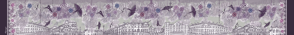 The exquisite silver and plum coloured moon tree print design features my delicate illustrations of swallows, woodland and architecture in the city of Bath.