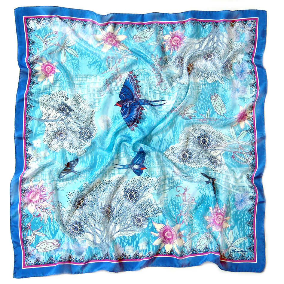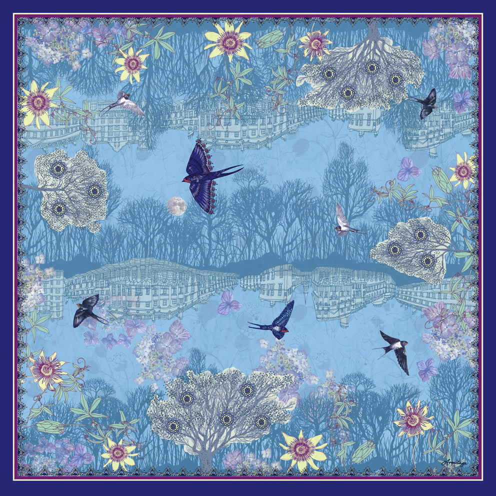 The exquisite passion blue design features my illustrations of swallows, passion-flowers, woodland and architecture in the city of Bath, with shimmering sky blue colour tones.