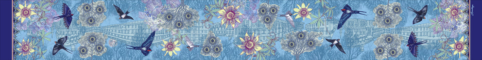 This silk scarf is part of the Moon Tree collection, it is an immersion into winter woodlands, rich in narrative and metaphor. Forests are the lungs for our planet, and in a way the lungs for our soul, and wellbeing. This collection of silk scarves, bags, purses and limited edition prints takes whimsical inspiration from a 17th century writer who hypothesised that swallows fly to the moon to hibernate, each print layers my illustrations of the moon, swallows and winter woodlands.