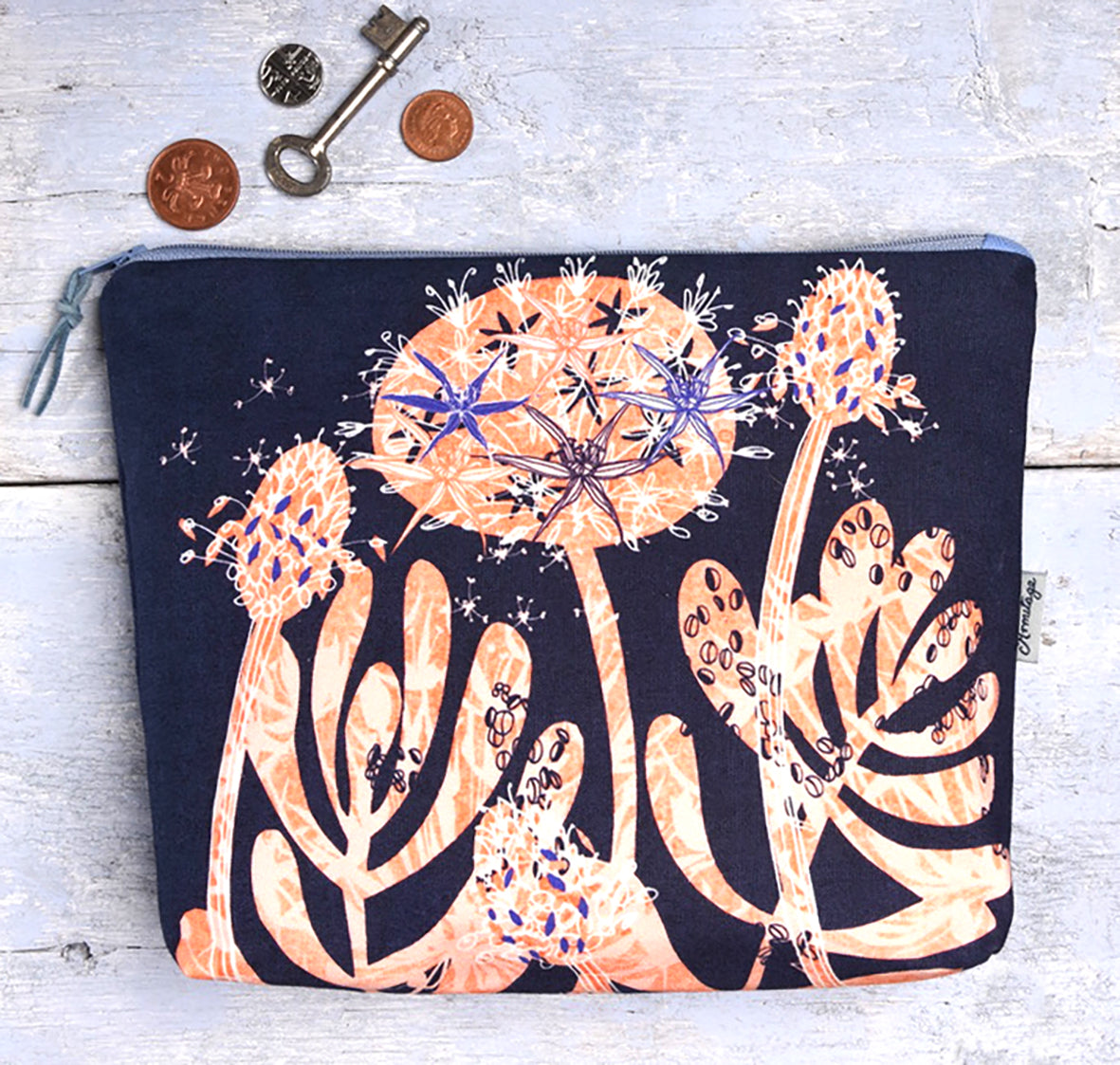 The beautiful Alium Halcyon wash bags are handmade in Cornwall, they are part of the Alium collection, this design features imagery of flora and fauna with fascinating hidden narratives. Studies of sculptural and architectural Alium flowers, which are part of the onion family; are layered with drawings of plantain, purported for its medicinal and culinary properties; and Equisetum or ‘horsetail’, which can be described as living fossil having existed for over 100 million years.