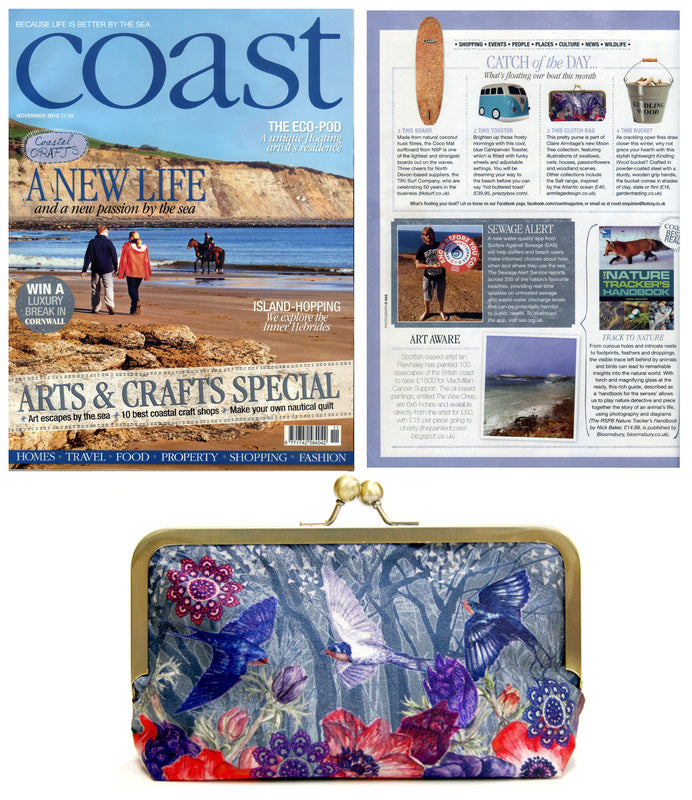 Coast Magazine featured Claire's Sky Ink silk clutch bag in the November 2013 issue.