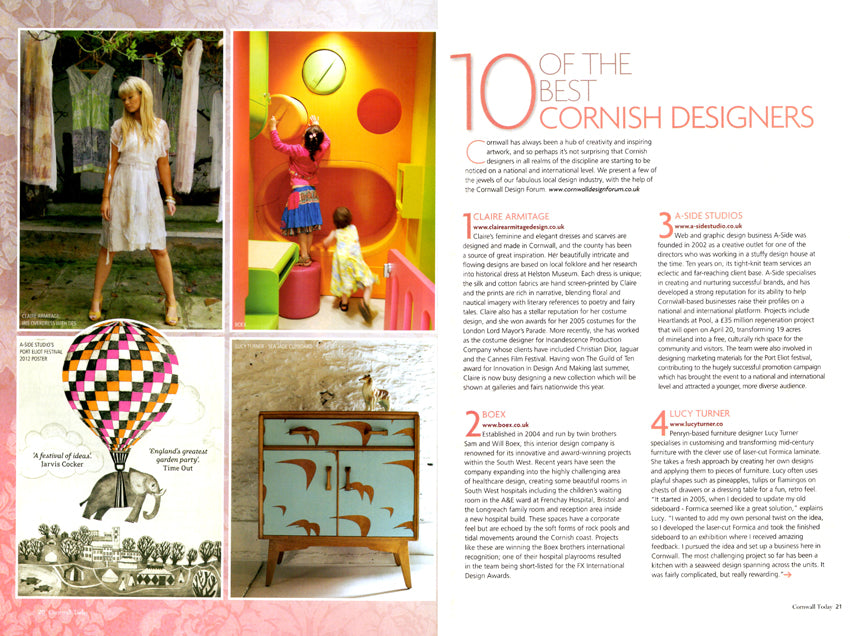 Claire was featured as one of Cornwall's best 10 designers in the April 2012 issue of Cornwall Today Magazine.