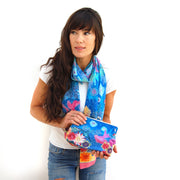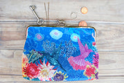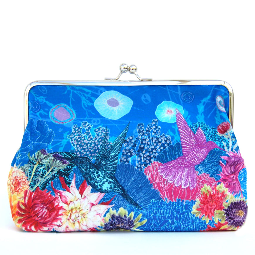 This silk clutch bag is part of the Museum Botanical collection. I was inspired by the natural history collections within Royal Albert Memorial Museum, particularly the 19th century collections of Echinoderms such as starfish and sea lilies, rare and tropical butterflies, and the adjacent treasure trove of bird specimens from across the world. I combined this research with collections from beyond the walls of the museum, including studies of pressed seaweed and coral collected in the early 20th century. The vibrant blue tones are complimented by magenta hues.