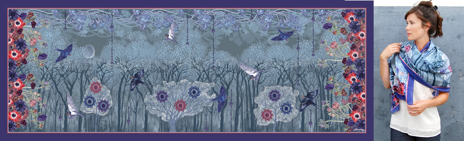 This silk scarf is part of the Moon Tree collection, it is an immersion into winter woodlands, rich in narrative and metaphor. Forests are the lungs for our planet, and in a way the lungs for our soul, and wellbeing. This collection of silk scarves, bags, purses and limited edition prints takes whimsical inspiration from a 17th century writer who hypothesised that swallows fly to the moon to hibernate, each print layers my illustrations of the moon, swallows and winter woodlands.